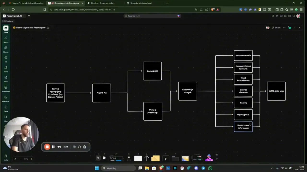 Monitoruje portale przetargowe 24/7 i przy użyciu AI selekcjonuje oferty o najwyższym potencjale, automatycznie analizując ich dokumentację. System eliminuje godziny ręcznego researchu i pobierania załączników, pozwalając Ci skupić się wyłącznie na przygotowaniu zwycięskiej propozycji.